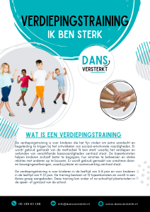 De verdiepingstraining is voor kinderen die het fijn vinden om extra aandacht en begeleiding te krijgen bij het ontwikkelen van sociaal-emotionele vaardigheden. Er wordt gebruik gemaakt van de methodiek ‘Ik ben sterk’ waarbij het verdiepen en verbinden van verschillende basisvaardigheden centraal staat, zodat kinderen in de toekomst minder uitdagingen kunnen tegenkomen. De bijeenkomsten helpen kinderen zichzelf beter te begrijpen, hun emoties te beheersen en sterke relaties met anderen op te bouwen. Er wordt gebruik gemaakt van creatieve dans- en bewegingsoefeningen, waarbij plezier en samenwerking centraal staat.