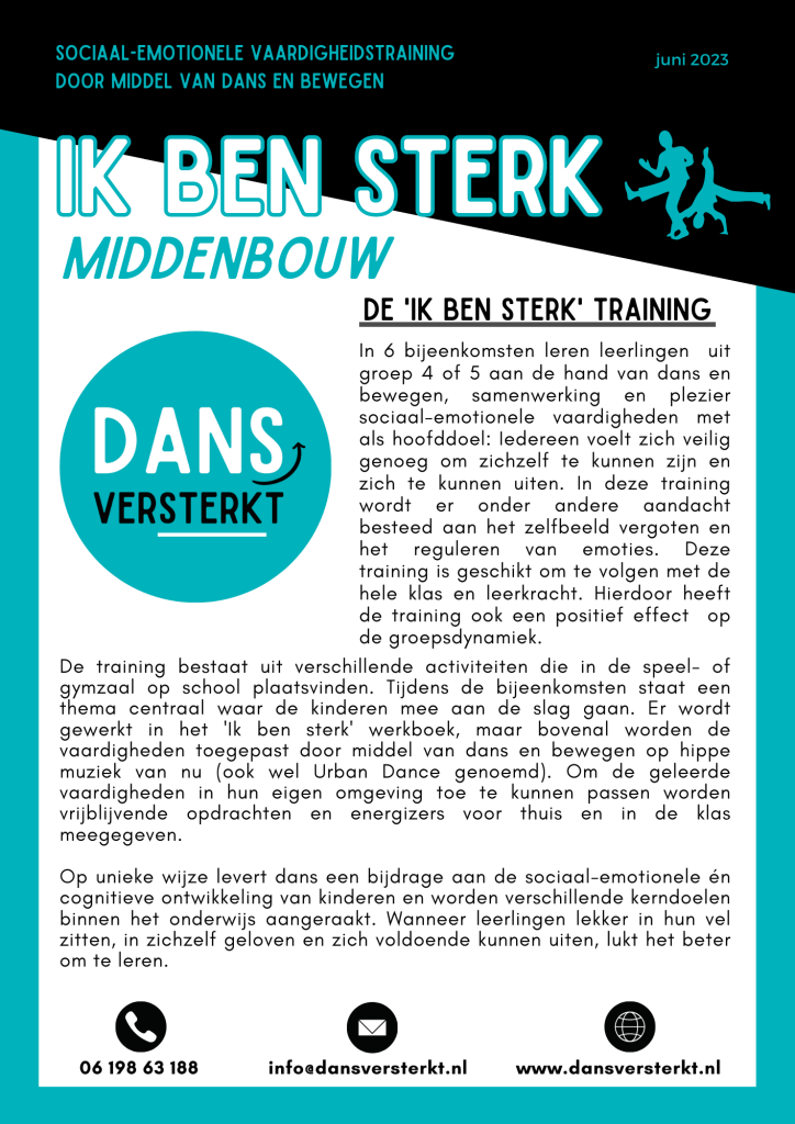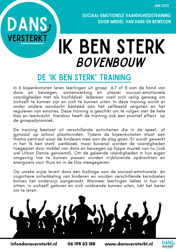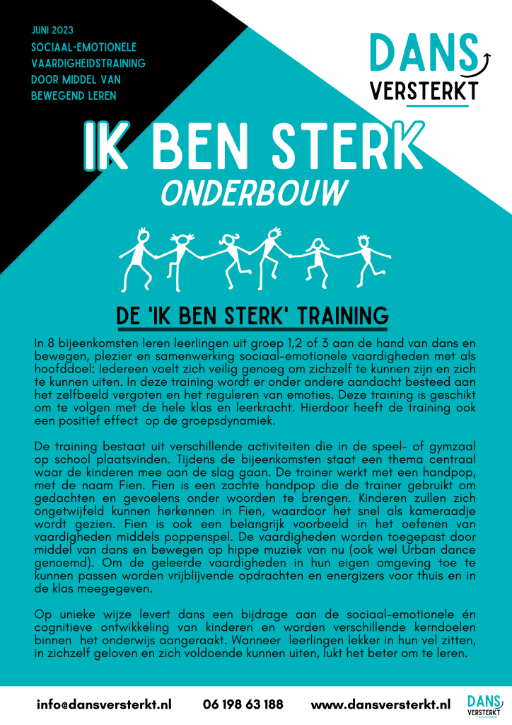 ‘Ik ben sterk’ is een unieke methode die leerlingen helpt om zichzelf beter te begrijpen, hun emoties te beheersen en sterke relaties met anderen op te bouwen. ‘Ik ben sterk’ kan als gehele training of met losse lessen worden aangeboden voor de hele klas en leerkracht. Het programma is onderverdeeld voor leerlingen in de onderbouw, middenbouw en bovenbouw. De trainingen en lessen voldoen aan de kerndoelen van het onderwijs, waardoor het een waardevolle aanvulling is op het lesprogramma en cultuureducatie.