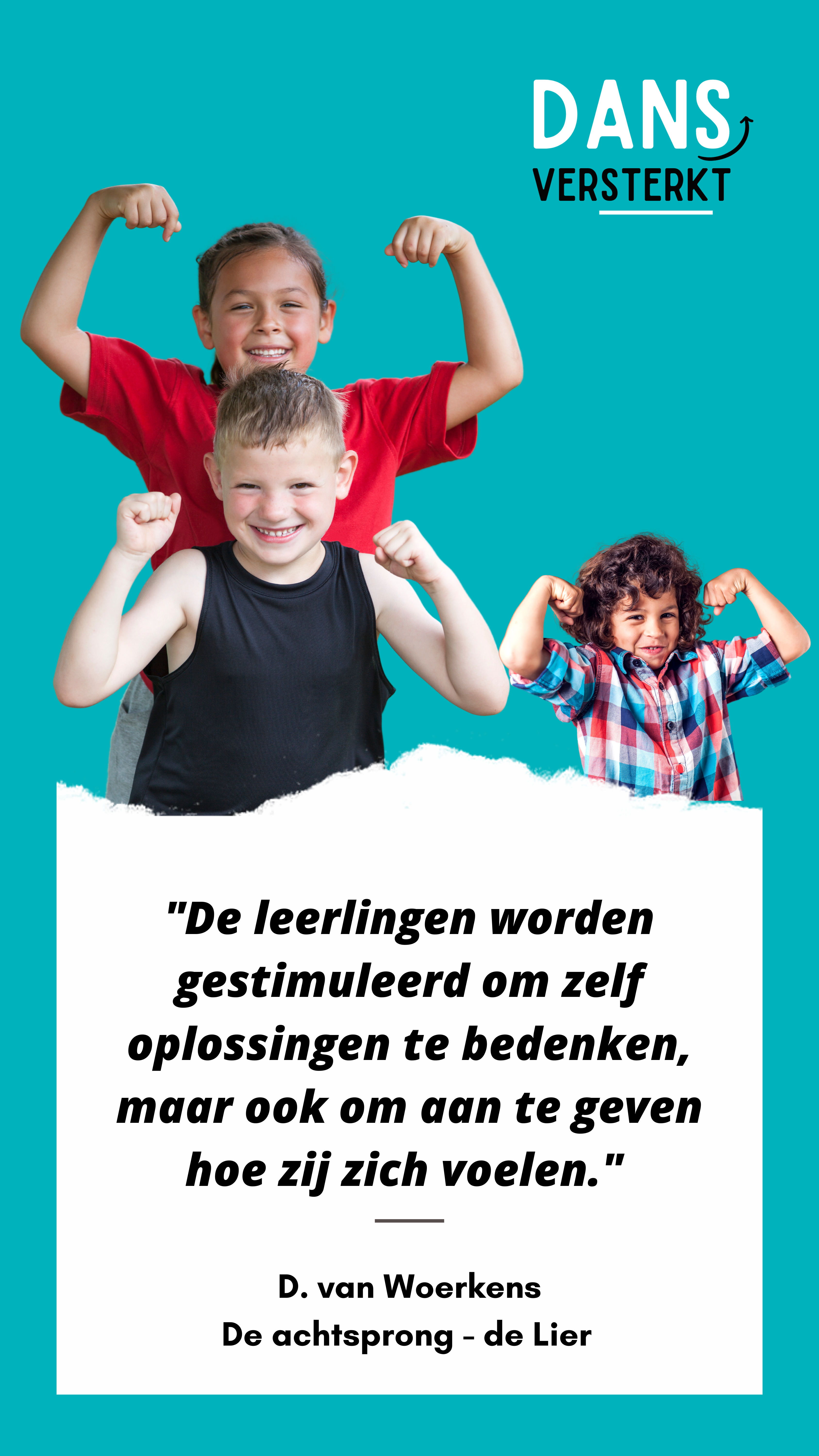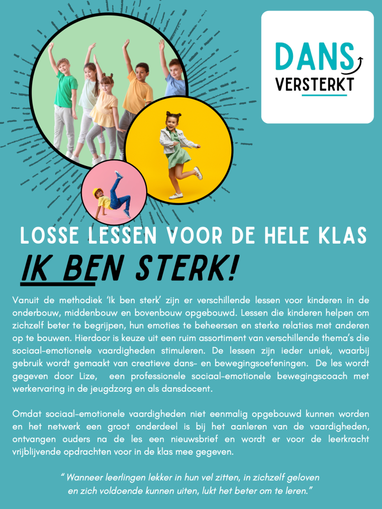 ”Op unieke wijze levert dans een bijdrage aan de sociaal-emotionele én cognitieve ontwikkeling van kinderen en worden verschillende kerndoelen binnen het onderwijs aangeraakt. Wanneer leerlingen lekker in hun vel zitten, in zichzelf geloven en zich voldoende kunnen uiten, lukt het beter om te leren..”